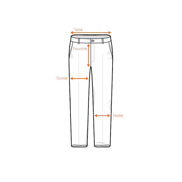 FOURCHE : Placez le ruban à mesurer au centre du pantalon et mesurez du haut du pantalon jusqu’au bas de la fourche.
