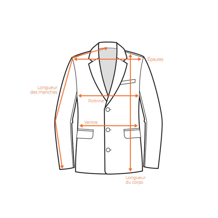 VENTRE : Placez le ruban à mesurer à l’endroit où votre ventre est le plus fort et mesurez horizontalement (environ au milieu du veston ou manteau).